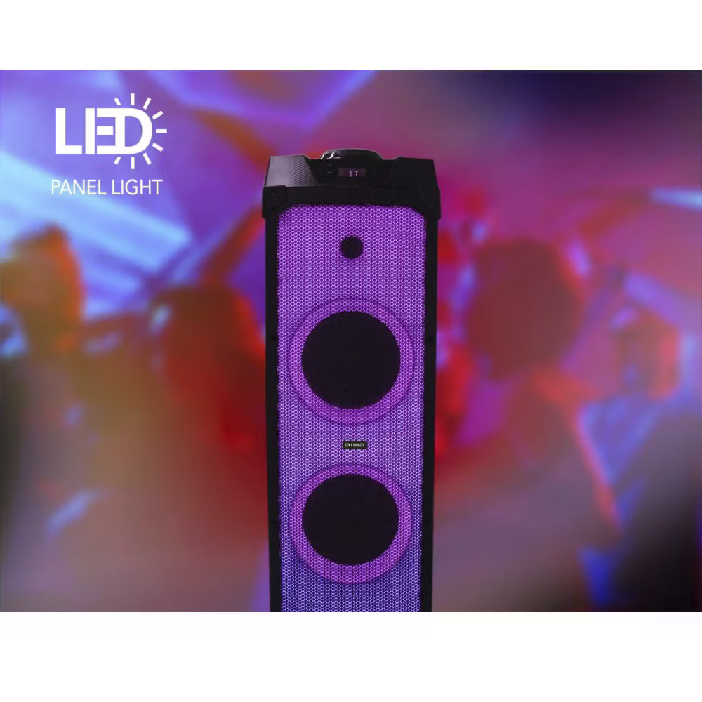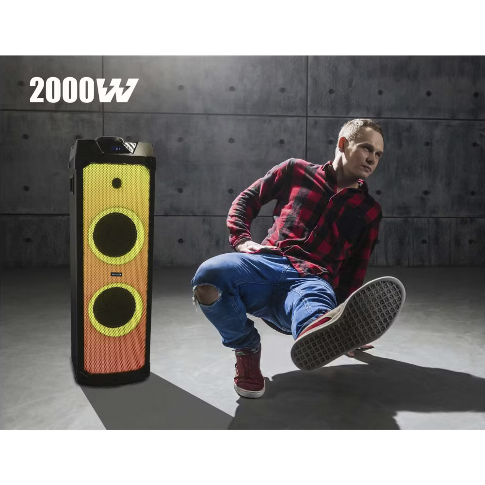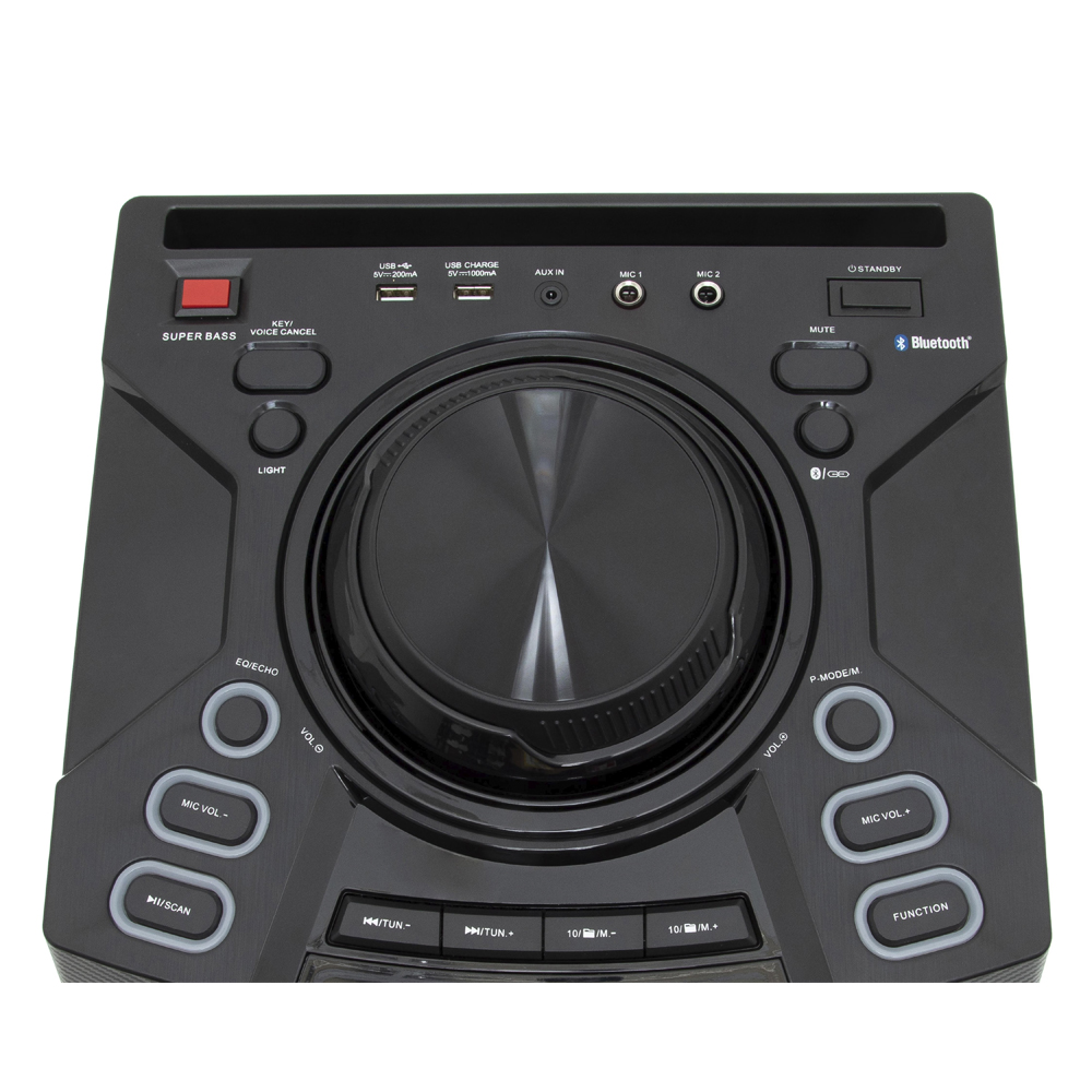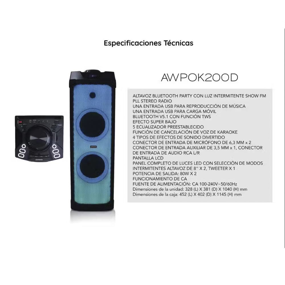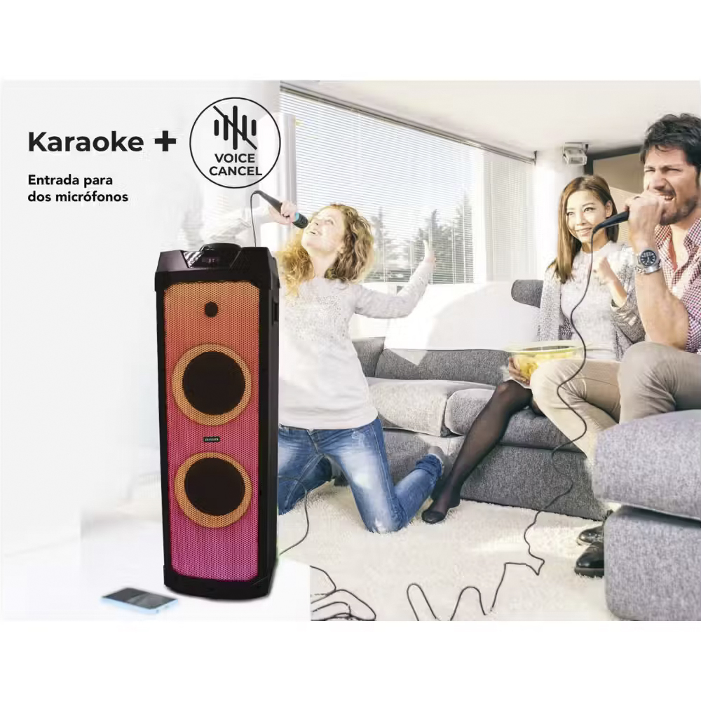 Arma la fiesta y amplifica tu música con doble potencia en sonido y calidad, completo panel de luces LED y tecnología TWS con la cual puedes escuchar con dos bocinas el mismo audio. Además si te gusta el karaoke, este sistema de audio es ideal para ti ya que cuenta con entrada para dos micrófonos y voice cancel.
