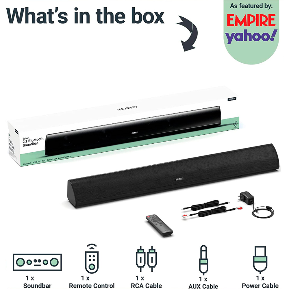 Con un sonido supremo, la barra de sonido Majority Teton, es una mejora increíble del audio de televisión. Con un impresionante altavoz de 2.1 canales que incluye un subwoofer incorporado, la Teton brinda una experiencia de audio que no se puede brindar solo desde su televisor. Conecte y reproduzca desde sus dispositivos multimedia a través de las conexiones USB, AUX o Bluetooth y adapte su audio para crear una calidad de sonido que haga que cualquier habitación se sienta cinematográfica.