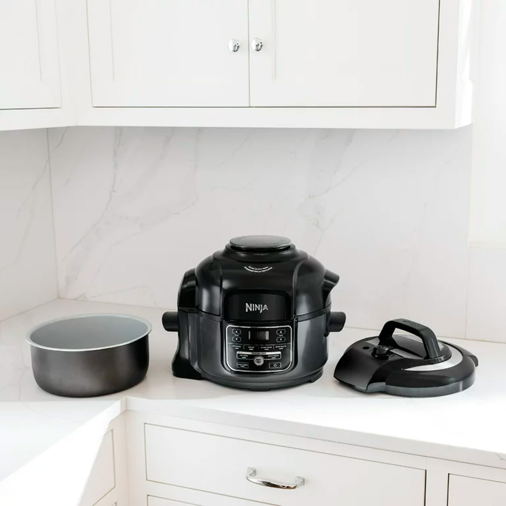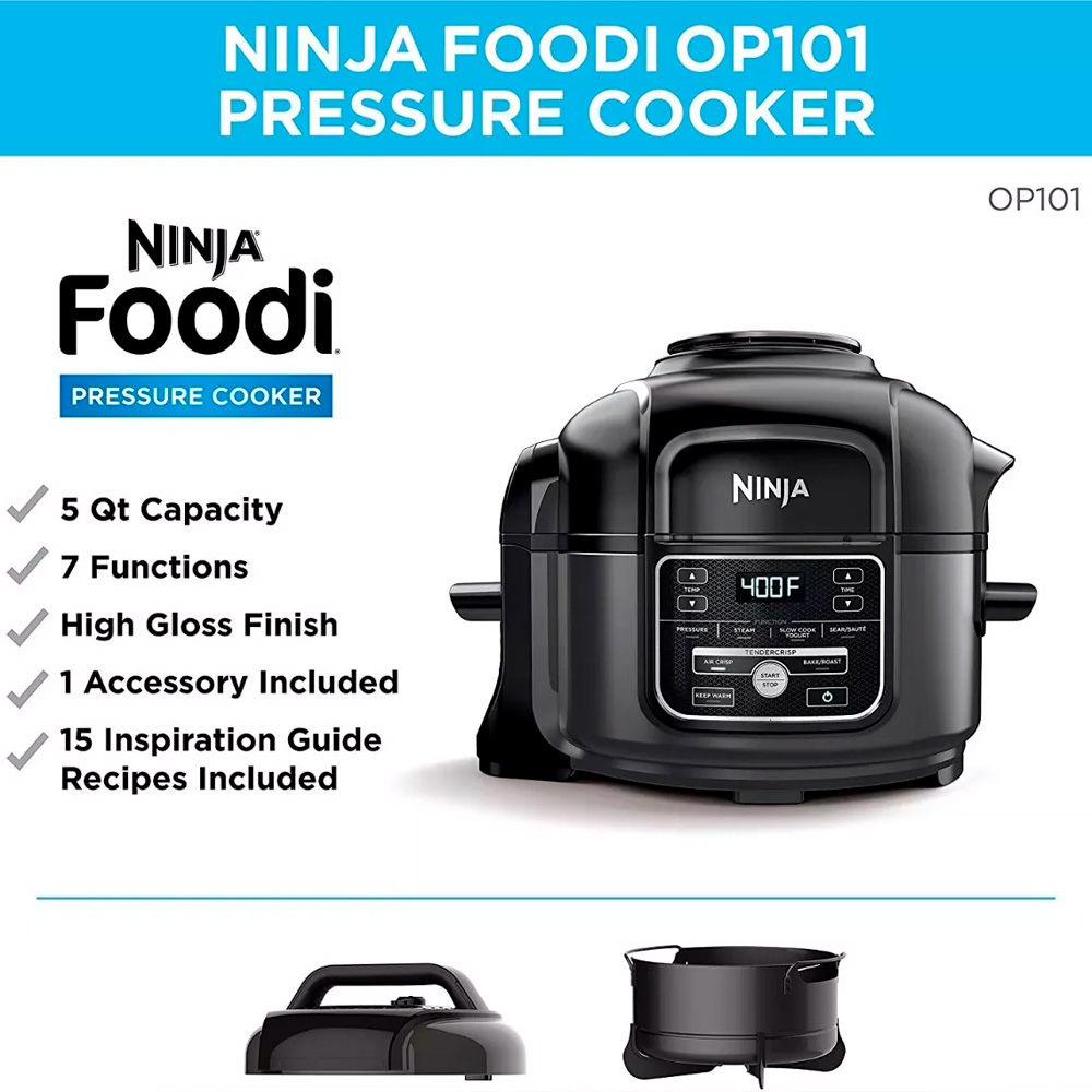 Conoce la olla a presión compacta Ninja Foodi. La olla a presión compacta de 5 qt. que crujiente. La tierna tecnología crujiente le permite presionar rápidamente los ingredientes de cocción para bloquear los jugos; a continuación, darles un crujiente; acabado de freidora de aire dorado. La olla de cocción de 5 Qt. y la cesta de cocina y crujiente hacen que sea fácil cocinar deliciosas golosinas y comidas en un instante.