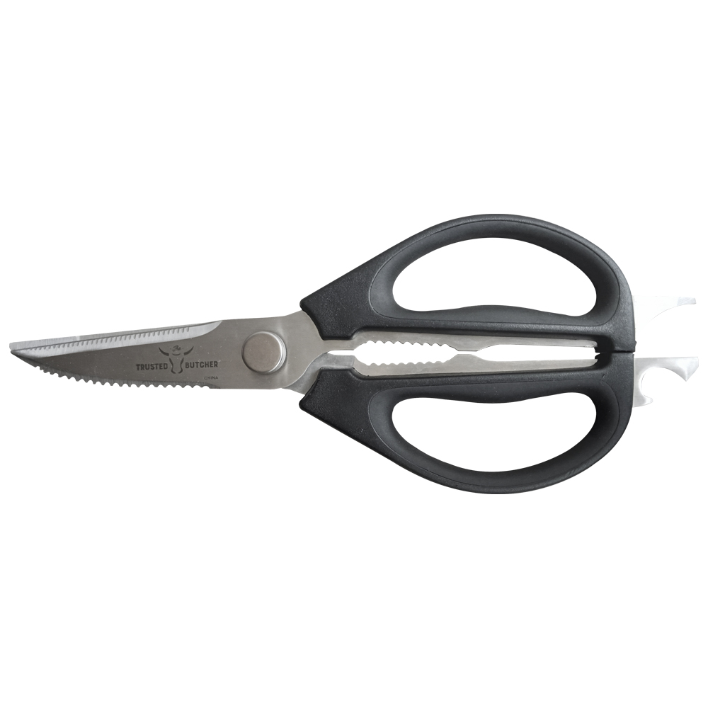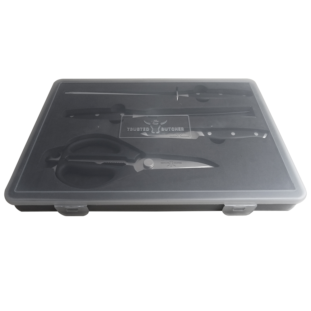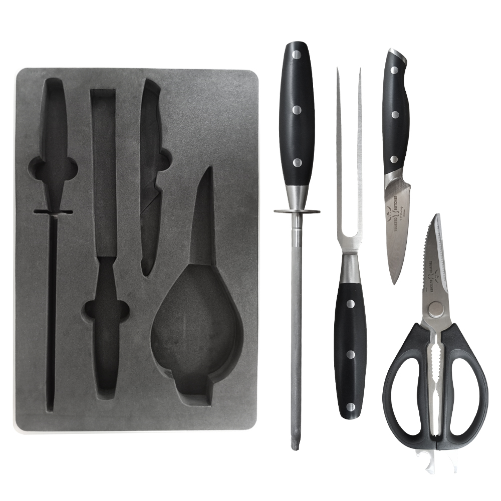 El juego de cuchillos de cocina profesional Trusted Butcher corta casi todo sin perder filo. Completa casi todas las tareas de corte ya sea con carnes, verduras, hierbas y mucho más. Disfruta de la capacidad de un cuchillo de chef profesional Santoku, además de unas tijeras multiusos que se pueden separar para convertirse en dos cuchillos individuales, un tenedor para carne y un afilador.